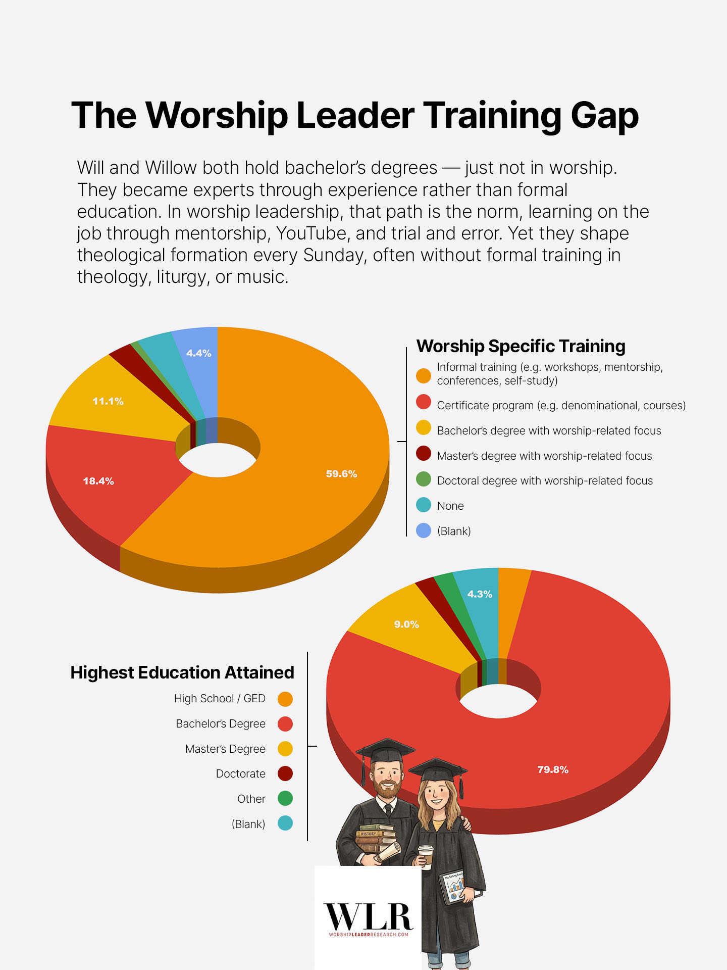 Only 11% have a bachelor’s degree in worship studies. Just 2.4% have a worship studies master’s degree, and less than 1% have a worship studies doctorate. Meanwhile, 80% have general undergraduate degrees, but in other fields. Of note, 60% have relied on informal training, and nearly the same percentage have never pursued any accredited worship education.