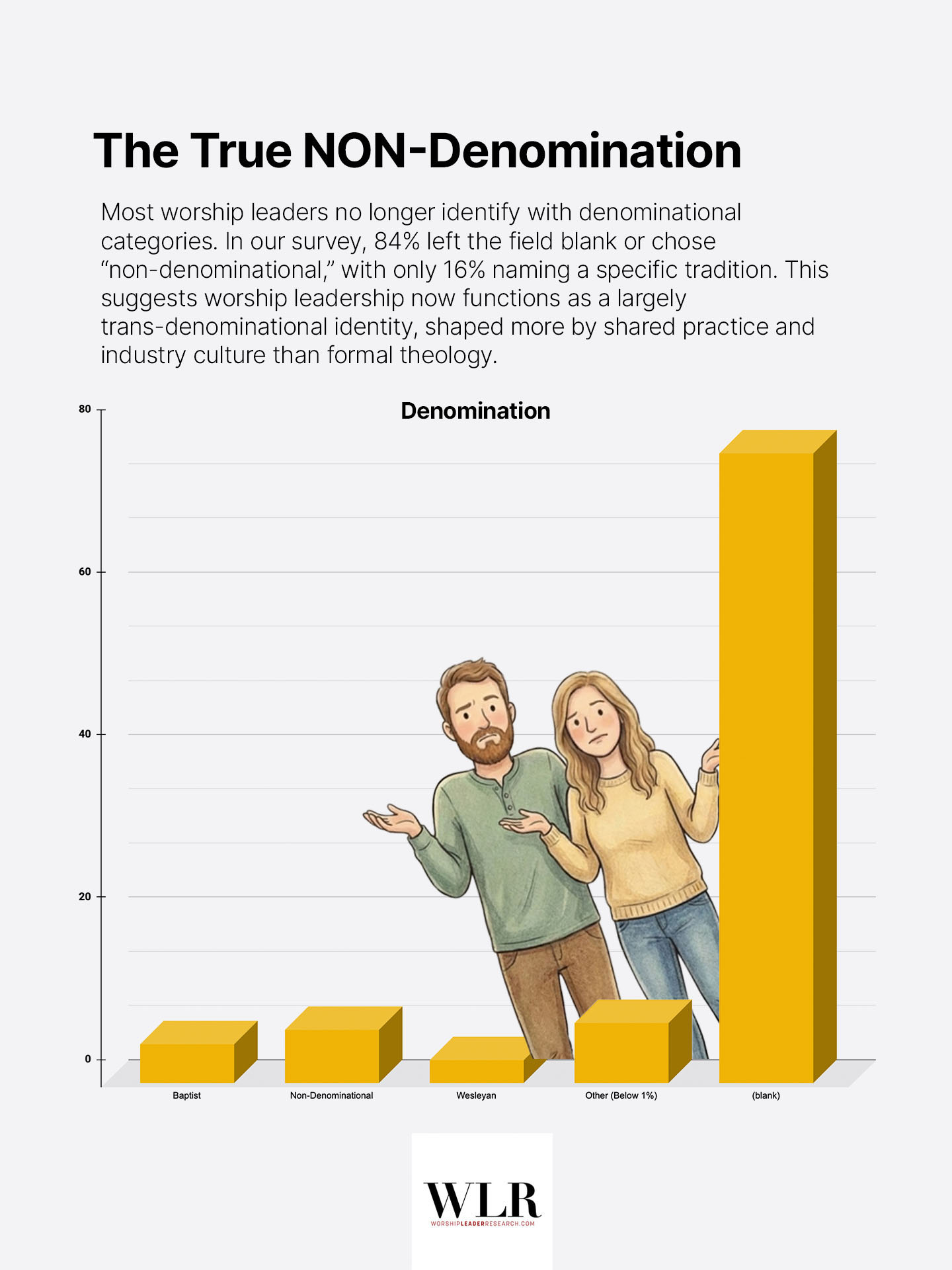 Here’s another finding that reveals something profound about the culture of contemporary worship: 77.5% of respondents left the denomination field blank. When you add those who selected “non-denominational,” it adds up to 84% of WLs.