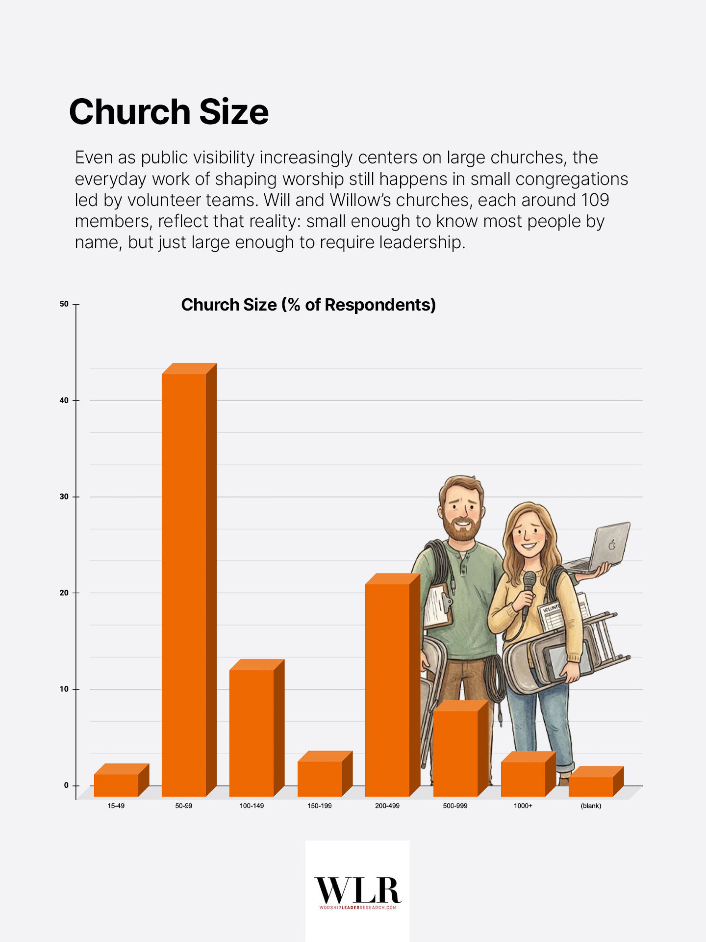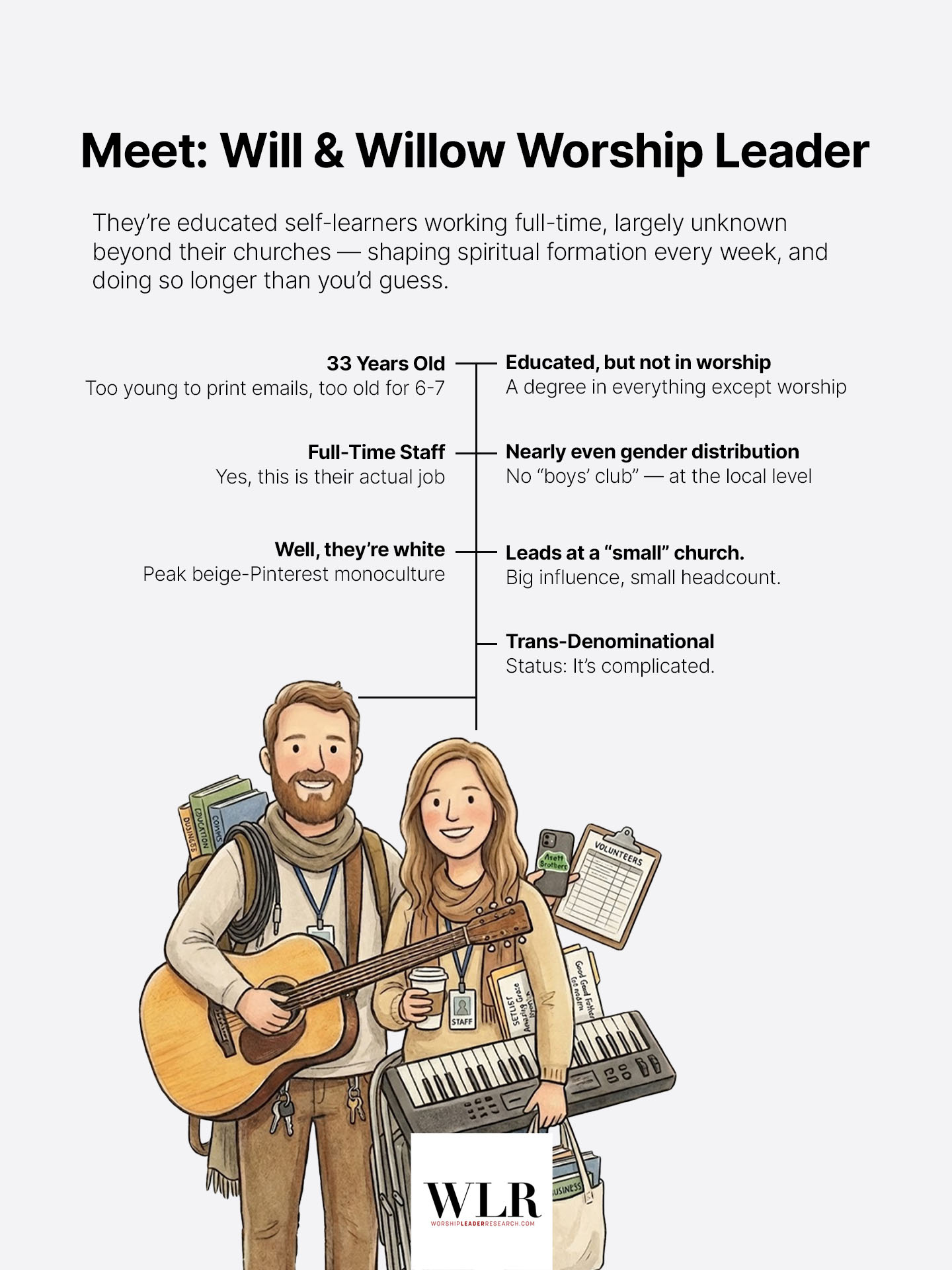 They are composite sketches emerging from our Spring 2025 survey data. They represent the thousands of real worship leaders shaping Sunday morning worship across North America. Will and Willow aren’t particularly famous. They aren’t the visible worship artists dropping new content on Spotify and social media. It’s important to understand who they are, though, because they’re forming the spiritual lives of congregations every week.